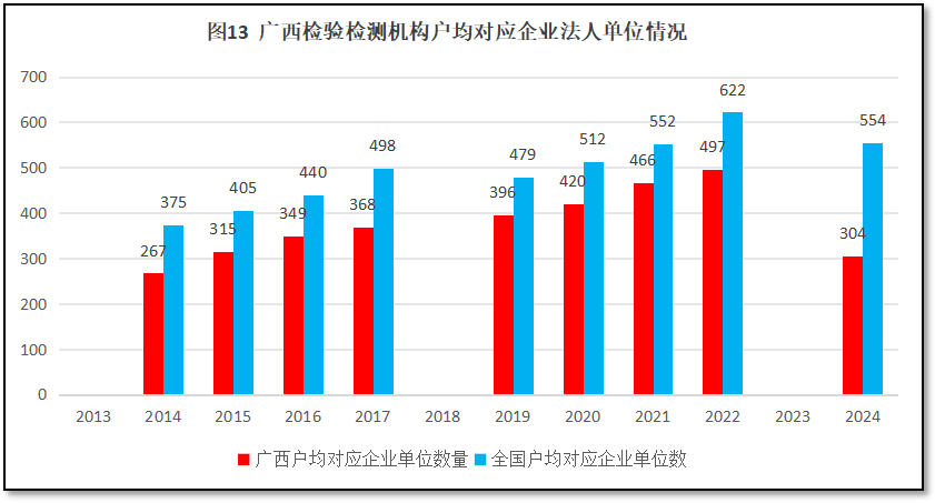 由图13可见,2022年之前,广西壮族自治区检验检测机构户均对应的企业法人单位数量缓慢增加,增幅稳定但一直比全国平均数要低。根据全国第五次经济调查结果,2024年末广西壮族自治区企业法人单位数量53.18万个,较2022年末统计数据出现较大下降,因此当年广西壮族自治区检验检测机构户均对应企业法人单位仅有304个,比全国平均数低250个。