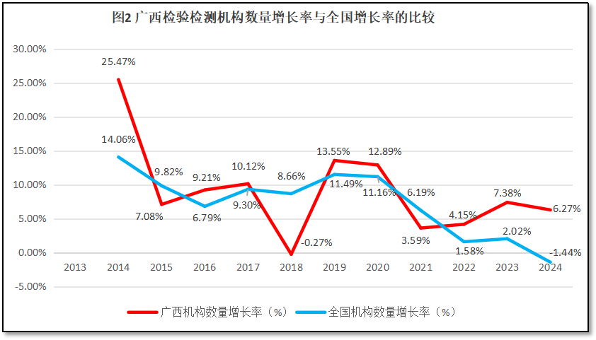 广西壮族自治区检验检测机构数量增长率与全国检验检测机构数量的增长率进行比较,结果如图2所示。