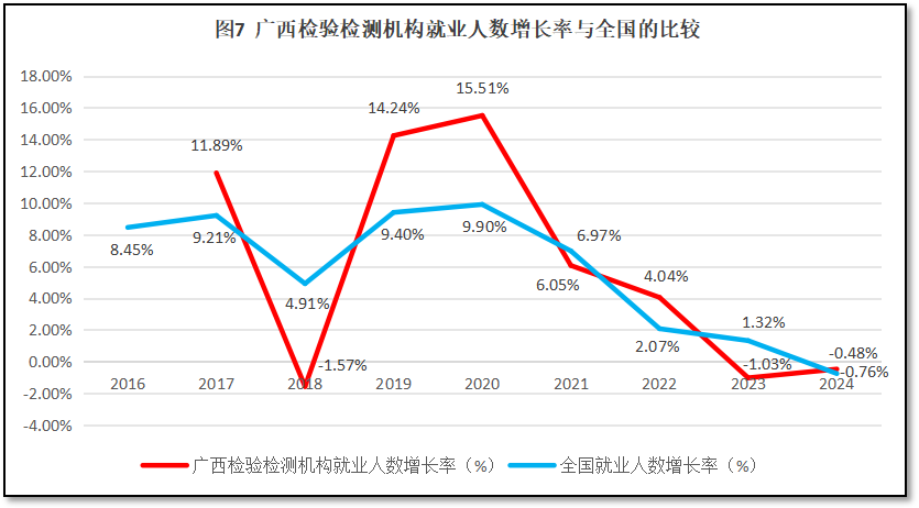 广西壮族自治区检验检测机构就业人数增长率与全国检验检测机构就业人数增长率的比较如图7所示。